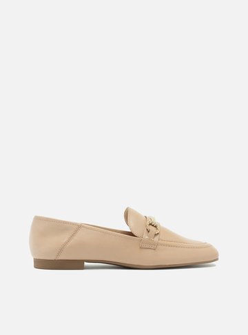 Mocassim feminino nude de couro. O sapato tem salto rasteiro e formato arredondado na ponta. Fechado, traz recorte lateral na gáspea e aplicação de bridão metálico dourado, preso por tiras, sobre o cabedal. Possui costura marcada no contorno da biqueira. Com palmilha bege e inscrição do nome da marca, exibe toda a parte superior do pé.
